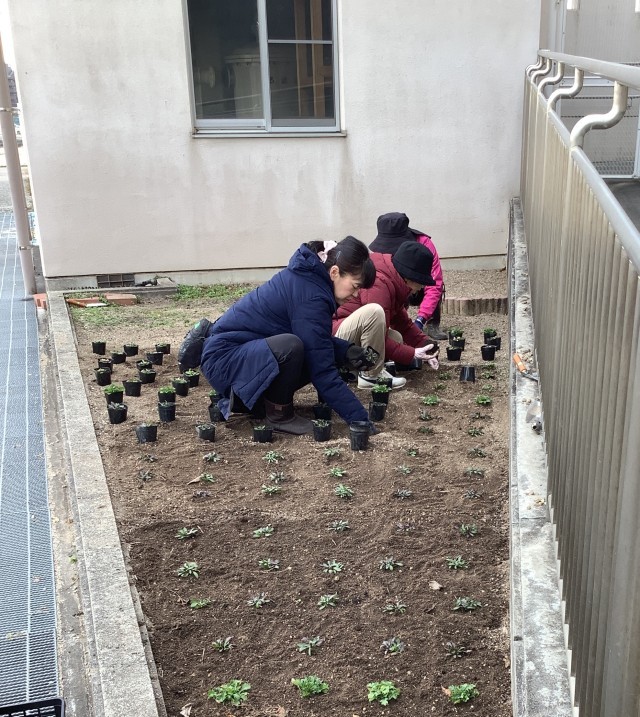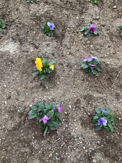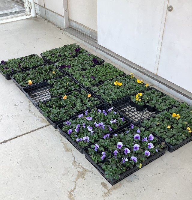 寒空の中、ガーデニングボランティアの方々が、春花壇のための苗植えを行ってくださいました。ビオラを植えました。