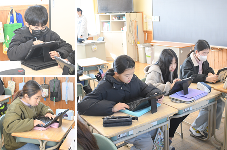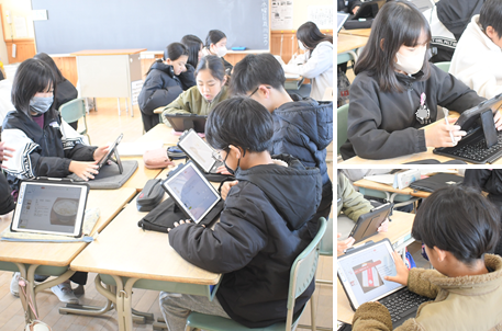 「米」についてグループで調べ学習をしてます。日本の米の自給率や白米と玄米の違い、外国産の米などをタブレットを使って調べています。