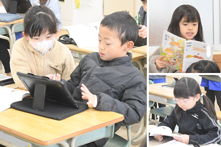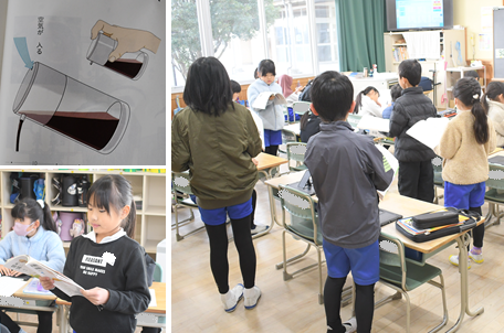 「あなの やくわり」の学習です。醤油さしには2つの穴が開いています。その理由をタブレットの「発表ノート」を使って、みんなに発表しています。