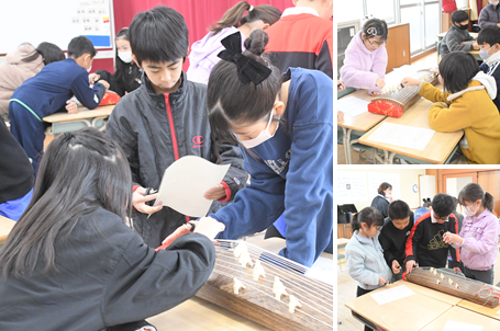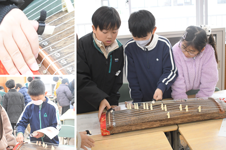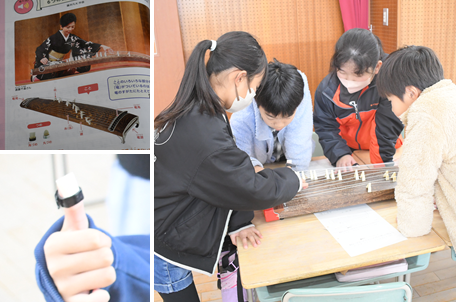 「琴」の演奏をしています。初めて触れる楽器に、子どもたちは興味津々です。楽譜を見ながら「さくらさくら」を演奏しています。