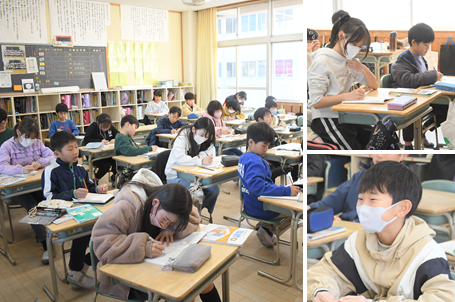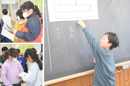 分数の学習です。「1より小さい分数」「1に等しい分数」「1より大きい分数」分数を3つのなかまに分けています。「真分数」と「仮分数」を習いました。