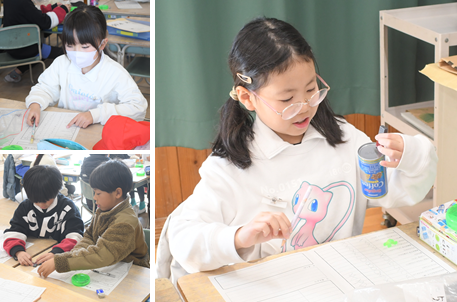 どんなものが磁石にくっつのか実験中です。アルミ缶、スチール缶、ガラス瓶やペットボトルなど、いろいろなものに磁石を近づけています。