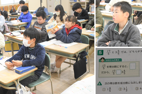 分数の学習です。帯分数と仮分数を比べ、どちらが大きいか考えています。比較をするためには、帯分数を仮分数に直す必要があります。