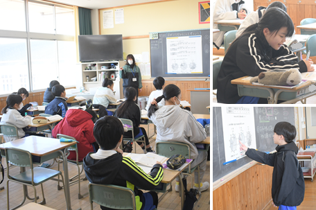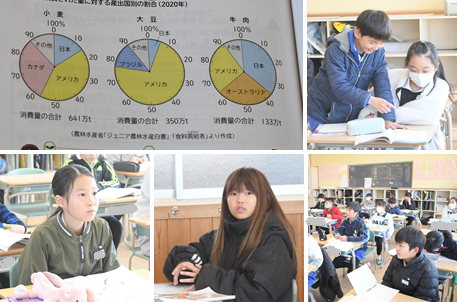 「帯グラフや円グラフを使って」小麦や大豆、牛肉の輸出国別の割合を表した「帯グラフ」や「円グラフ」を見て気づいたことを発表しました。
