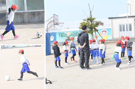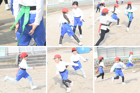 今日はとても暖かく、運動場で体を動かすには絶好の天候です。1年生が「サッカー」と「しっぽとり」をしています。