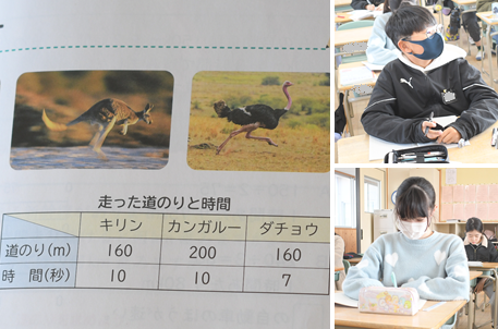 「速さ」の学習です。200mを10秒で走るカンガルーと、160mを7秒で走るダチョウではどちらが速いと言えるのでしょうか?秒速に直して答えを求めています。