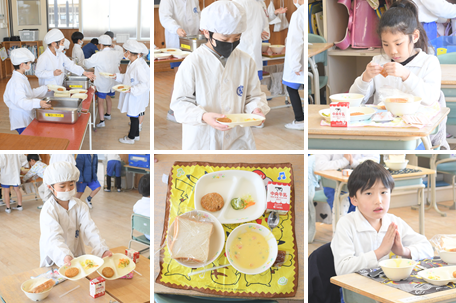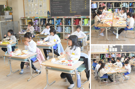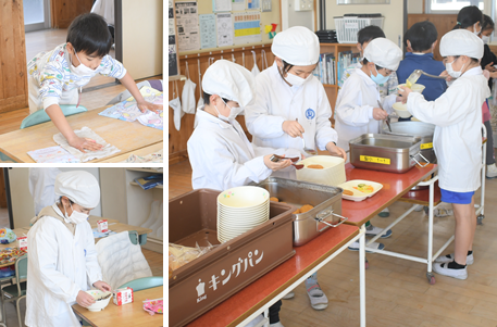 今日の献立はスライスパン、ミンチカツ、レモンサラダ、コーンスープ、りんごジャムになります。1年生の様子です。