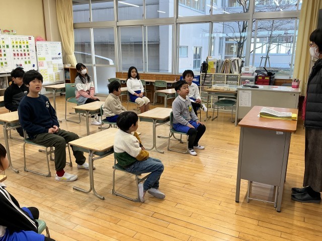 みどり、わかばでは、合同で朝の会を行なっていました。姿勢良く話を聞いていました。