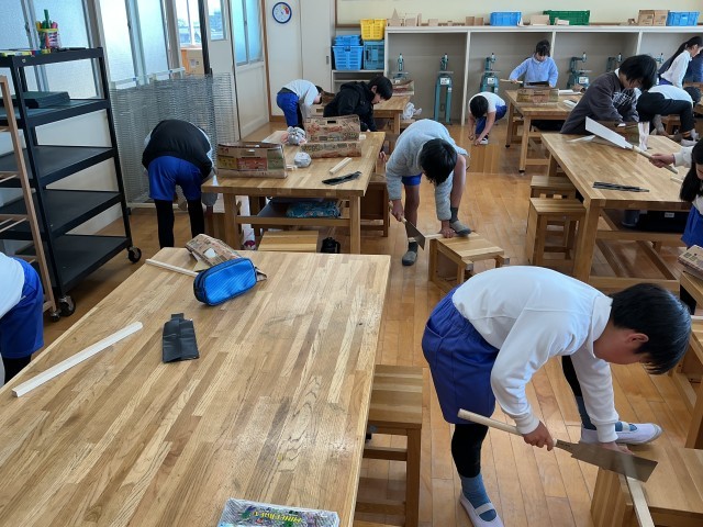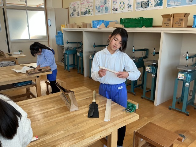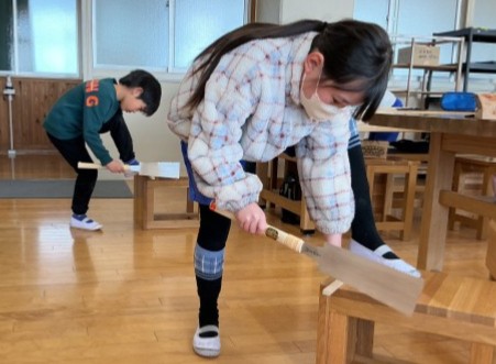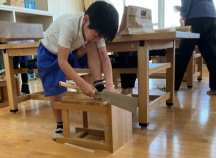 「のこぎりザクザクつないでつけて」では、のこぎりの安全な使い方を学びました。子どもたちは、頷きながら真剣に話を聞いていました。はじめは「木が動いちゃう」と言ってなかなかうまくきれませんでしたが、2時間授業の最後には、上手に切れるようになリました。図工補助ボランティアさんにも入っていただき、安全に楽しく活動できました。