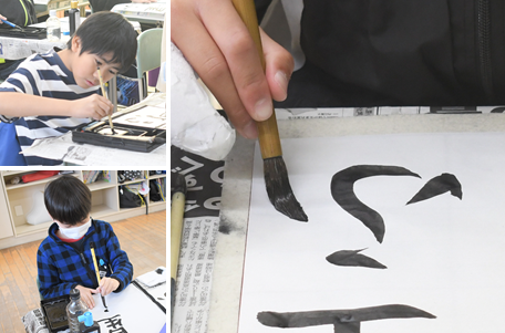 毛筆です。今日の課題は「星ふる町」です。ひらがなの「ふ」の文字が難しそうです。