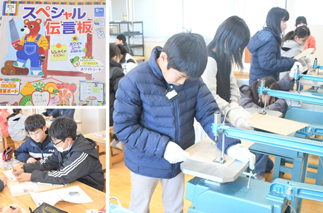 電動糸のこぎりを使って、木材を切断して「伝言板」を作っています。電動糸のこぎりは、刃の取り付けから行っています。安全第一で作業をしましょう。