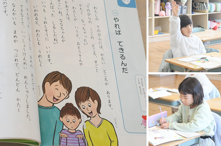 「やれば できるんだ」の読み物を通して、頑張って続けているとどんないいことがあるか、みんなで話し合っています。