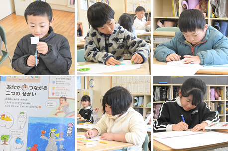 「あなでつながる 二つのせかい」画用紙の表と裏に絵を描きます。画用紙に穴をあけて、穴をくぐると別の世界へ行きます。どんな世界になっているのでしょう?