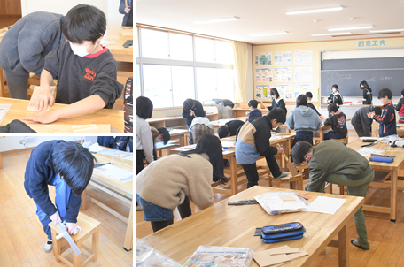 「カクカク板を組み合わせたら」今日は切断に入りました。4年生は3年生の時ものこぎりを使っています。板をまっすぐに切れるかな?