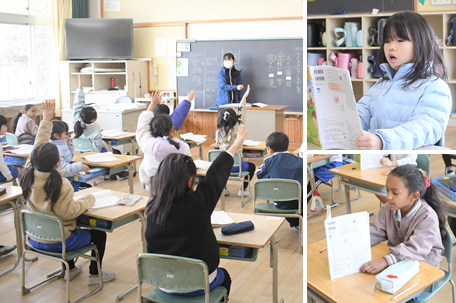 「小がっこうのことを しょうかいしよう」小学校では、春夏秋冬の季節にどんな行事があるのか、もうすぐ入学してくる1年生に学校のことを紹介する内容を考えました。