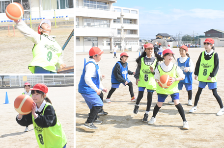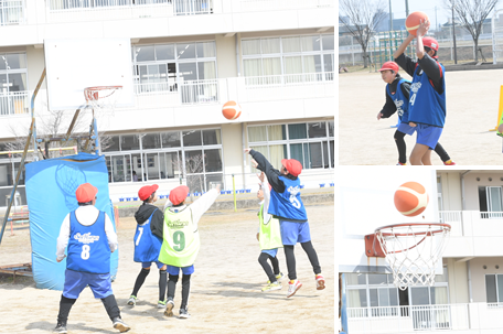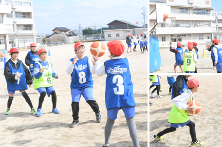 バスケットボールに取り組んでいます。こちらもドリブルをしないでパスだけでつないでいます。ボールを持っていない選手が動かないとボールが前へと進みません。みんな頑張って走っています。