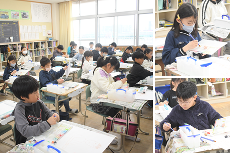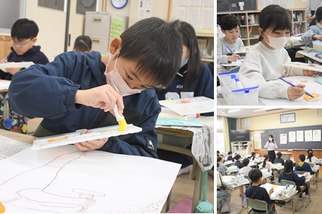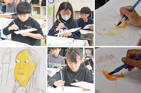 未来の自分を想像して描いています。肌の色を一色で塗るのではなく、黄色、黄土色、茶色、赤色などを混ぜて表現しています。