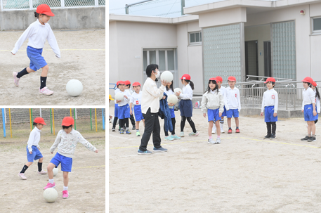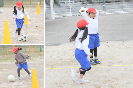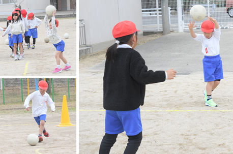 サッカーに取り組んでいます。友達がスローインで投げたボールをトラップしてドリブルをしながらコースを進んでいきます。上手にドリブルできるかな?