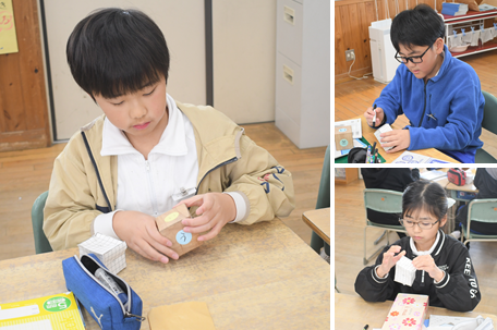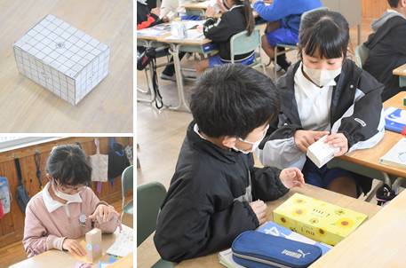立体の学習です。直方体と立方体には、面、辺、頂点がいくつあるのか確認をしています。