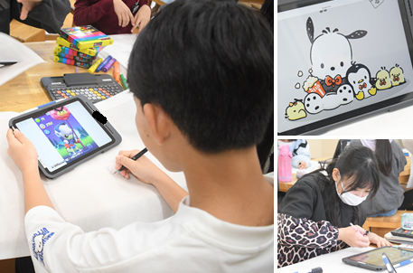 今年度の作品を入れて持ち帰る「作品バッグ」の制作です。お気に入りのイラストをタブレットで検索して絵を描いています。