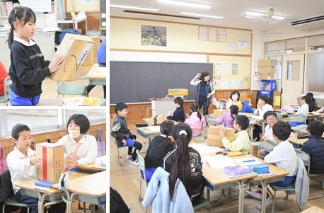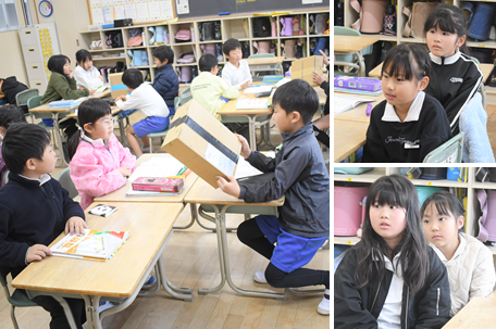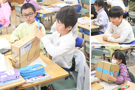 「はこの かたち」の学習です。箱を手にして、面、辺、頂点がぞれぞれいくつあるのか数えています。