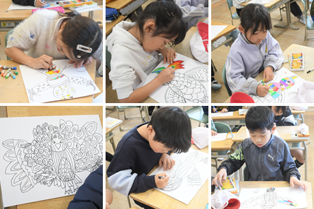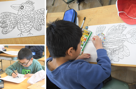 卒業期に向けて、壁面の掲示物を作っています。テーマは「飛び立つ鳥」みんなとても上手に描いています。