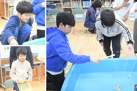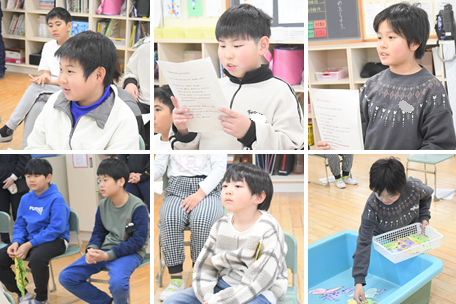 みどり・わかば学級のお別れ会です。魚つりゲームや鬼ごっこなど、子どもたちが考えた遊びで楽しみました。最後は6年生へ、歌とメッセージカードのプレゼントをしました。