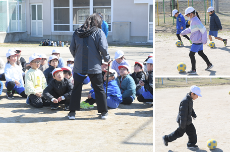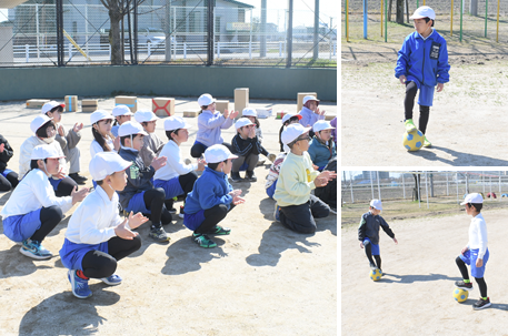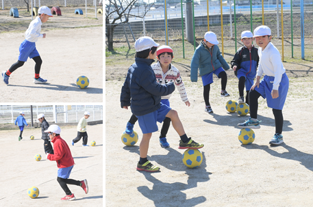 サッカーの練習をしています。ドリブルをして、笛が鳴ったらすぐにボールを止めます。自分からボールが離れすぎないようにドリブルをしなければなりません。