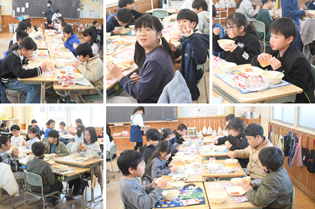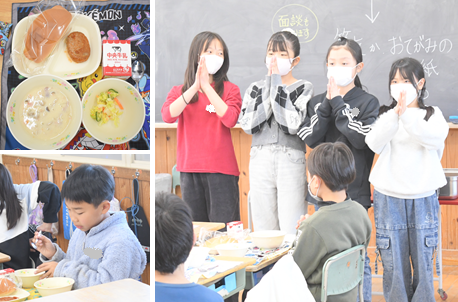 今日の献立は、ミルクロールパン、ハンバーグのトマトソースかけ、鶏肉ときのこのクリーム煮、コールスローです。4年生の様子です。