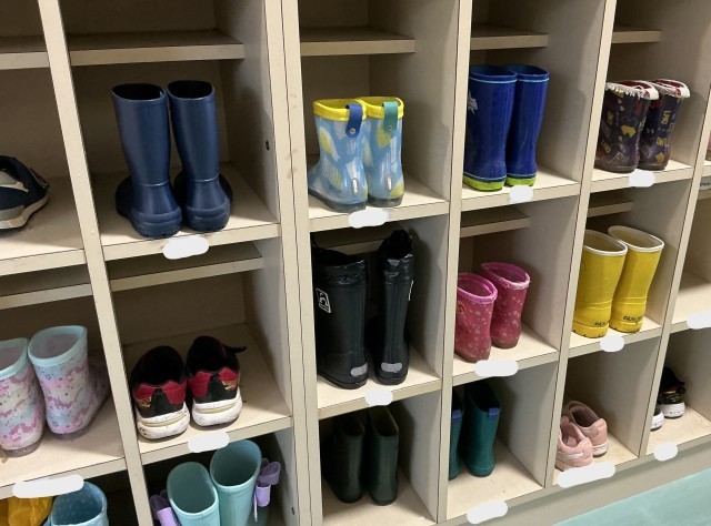 子どもたちが去った後の昇降口の様子。大雨で荷物もあって大変な中でしたが、下駄箱の整頓がきれいな学級がたくさんありました。落ち着いたスタートを切っている証拠です。