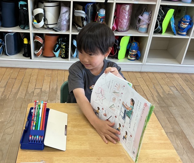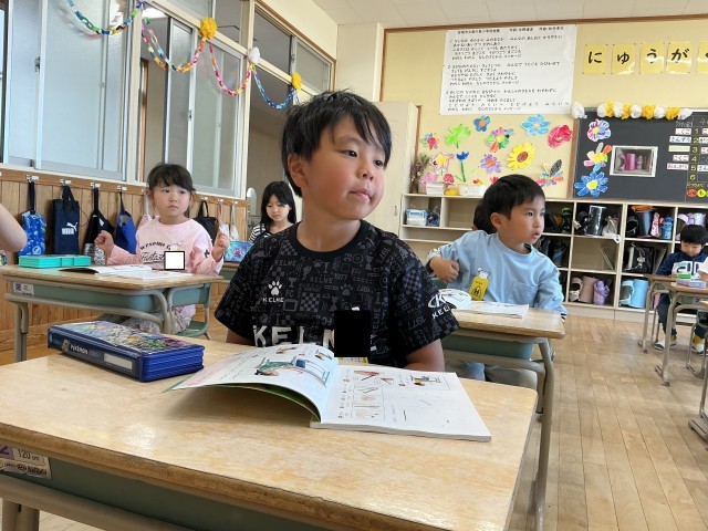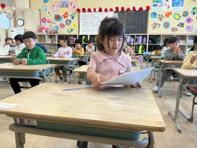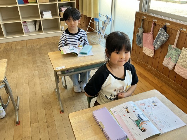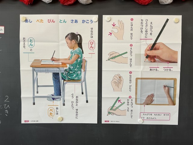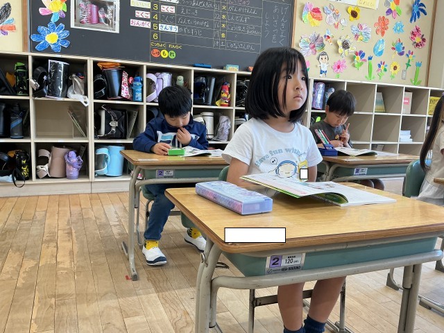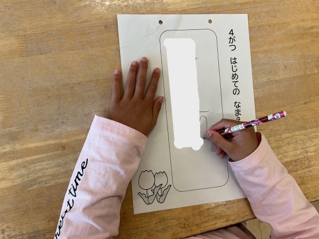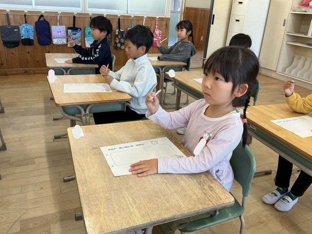 1時間目は国語でした。文字を書く姿勢、鉛筆の持ち方の学習をした後、自分の名前を書きました。ゆっくり、力を入れて大きな文字を書いていました。