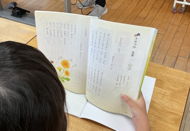 音読練習では、詩「きせつの足音」を行いました。ことばのリズムのおもしろさを味わえるよう、エレクトーンのリズムに合わせて、音読しました。