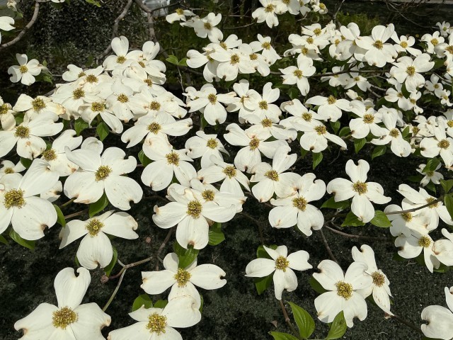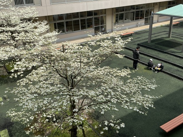 学校の外からは見えない場所。校舎の中庭に咲く「ハナミズキ」の花が満開を迎えています。