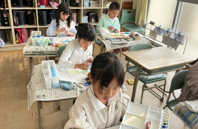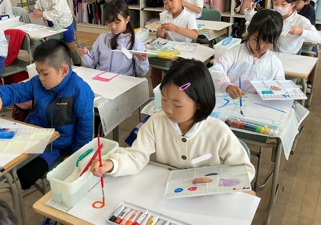 図工「絵の具と水のハーモニー」では、絵の具に入れる水の量をいろいろ変えて、描き方を工夫しながら表現を楽しむ学習です。
