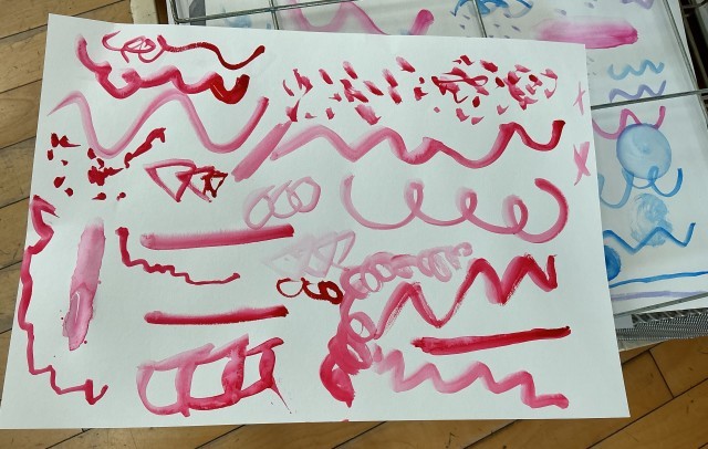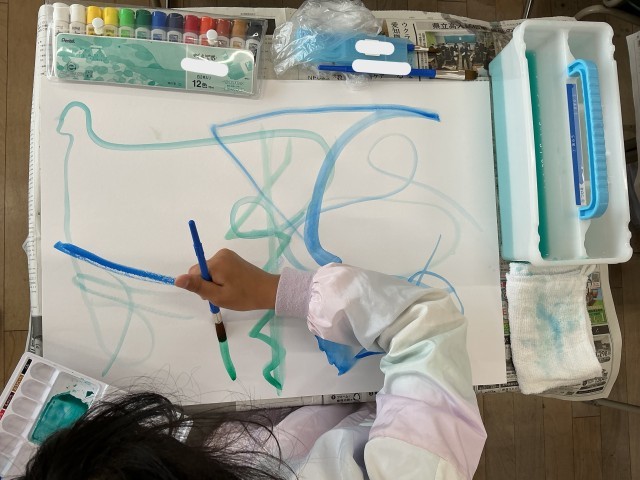 自由に線をひいたり、くるくると筆を動かしたり…。「こんな大きな紙で描くのは初めてかも」と言いながら、楽しく描いていました。