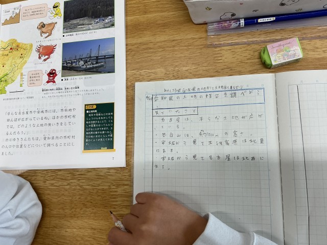 社会「わたしたちの県」の単元です。愛知県の土地の様子について学習していました。