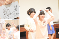 学年レクレーションの時間です。広間に集まり、実行委員が考えたジェスチャーゲームとクイズを楽しんでいます。