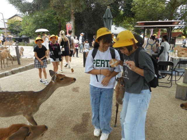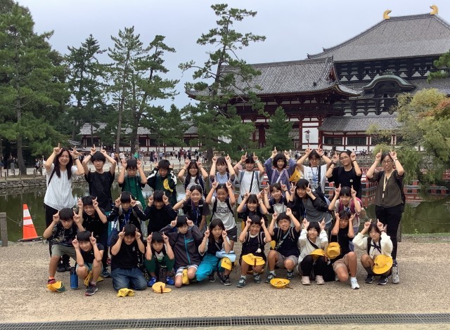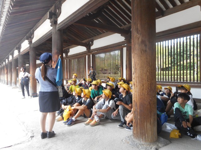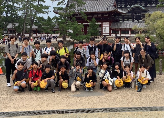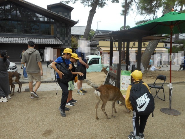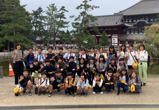 修学旅行2日目は、バスに乗って奈良へ行き、東大寺と法隆寺を見学しました。大仏殿見学後、鹿せんべいをあげる体験にチャレンジする子もいました。法隆寺では、ガイドさんの案内を聞いて、仏像一体一体の表情に注目して見学しようとする姿が見られました。今後は各学級で「修学旅行記」作りを行う予定です。たくさんの思い出を大切に残していきたいと思います。