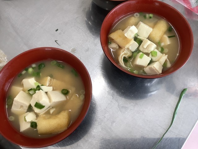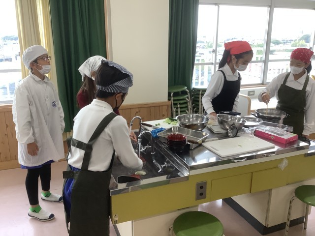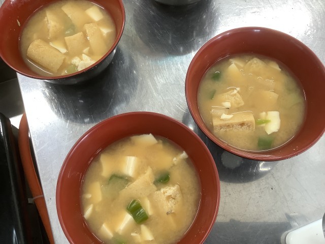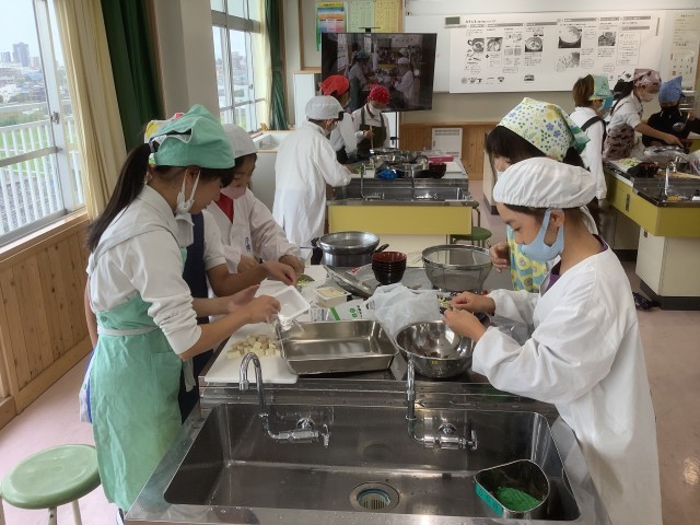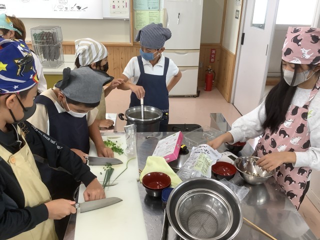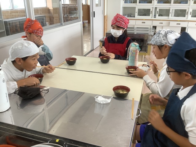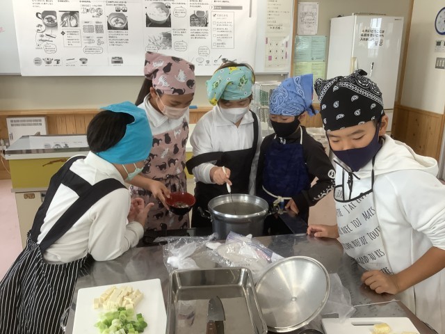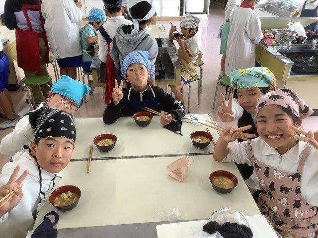 家庭科「食べて元気に」の学習で「みそしる」作りをしました。煮干しでだしをとり、実や味噌を入れておいしいみそしるができました。
