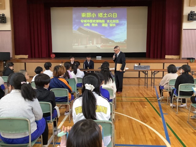 郷土の日の事前授業として、歴史博物館の学芸員さんに東部小学区にあるお寺や遺跡について教えていただきました。