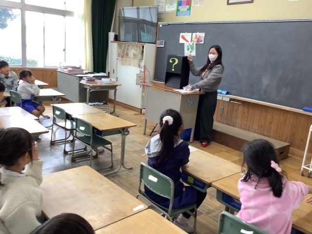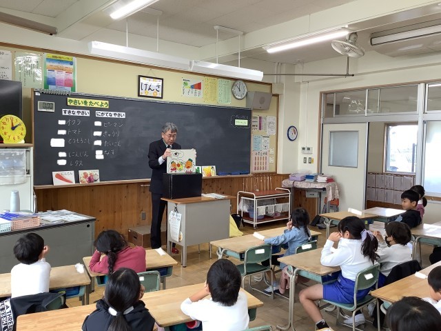 北部調理場の方を講師にお招きして、1年生が食に関するお話を聞きました。野菜のはたらきについて学び、苦手な野菜でもしっかり食べたいという思いをもちました。