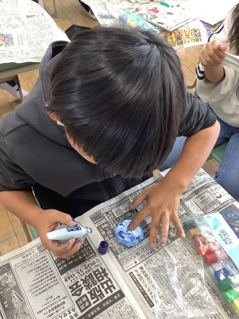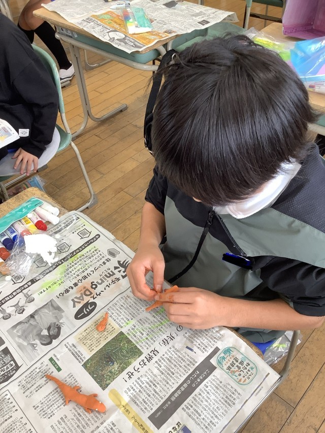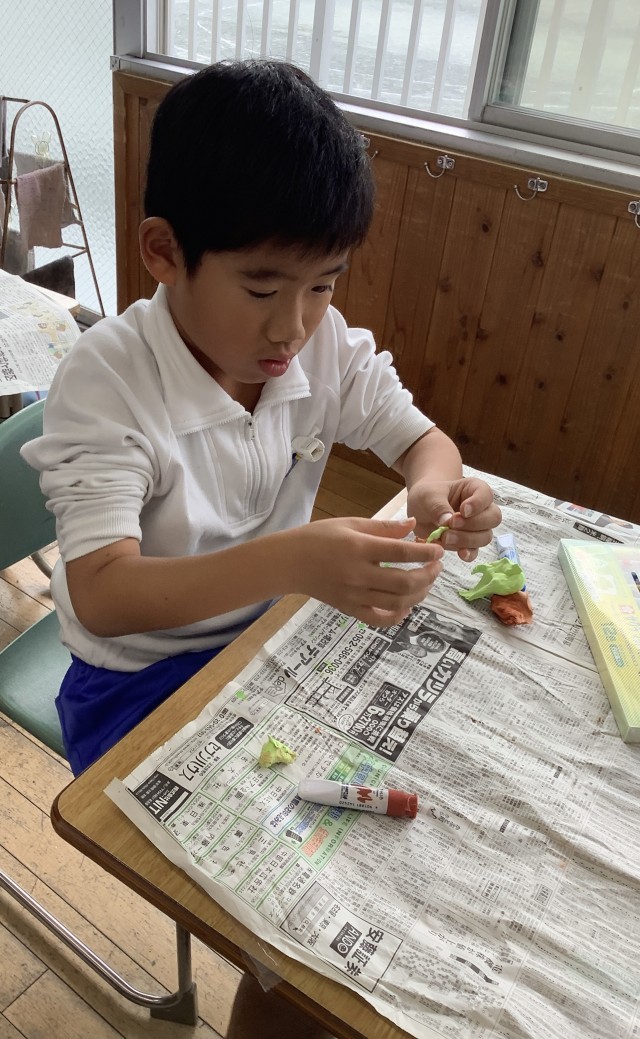 図工では、はこの中に自分の表したい世界をつくっています。今日は、紙粘土を使って、はこの中に入れるものを作りました。色々な材料を使って素敵な世界が作れるといいですね。