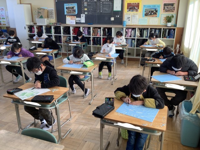 図画工作では、木版画に取り組んでいます。自分が好きな動物を選び、彫刻刀を使って彫ります。彫刻刀は、4年生で初めて使う道具ですが、怪我をしないように、手を置く位置に気をつけながら、丁寧に彫っていました。