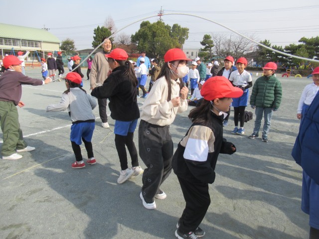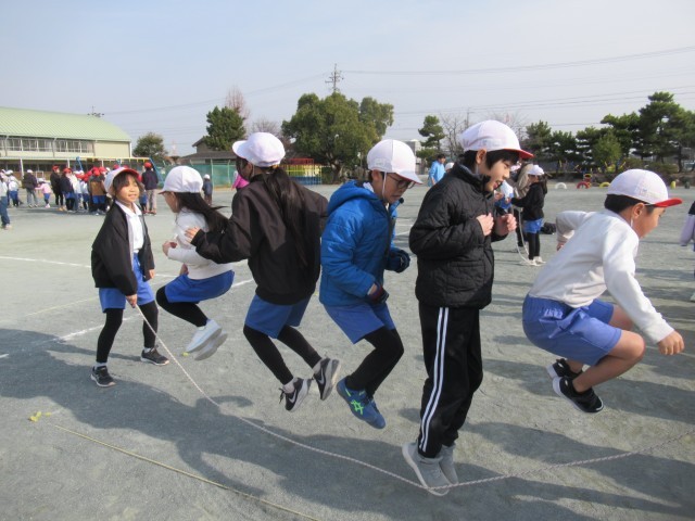 ロングタイムの時間に、2年生のペアの友達と大縄をしました。声をかけ合いながら、楽しく跳ぶことができました。ペアの友達との絆を深めることができました。