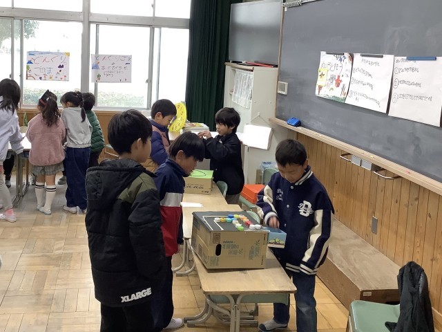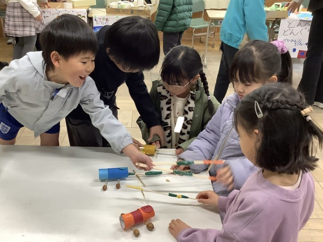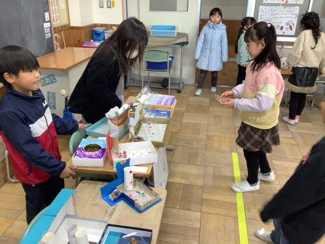 1年生全体で、学習発表会の練習をしました。どんぐりやまつぼっくりでおもちゃを作り、お店屋さんを開きました。店員さんとして一生懸命説明をしたり、お客さんとして楽しそうに遊んだりしていました。