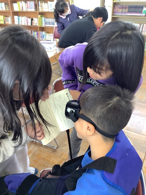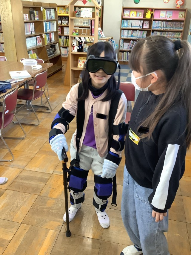 高齢者疑似体験を行いました。ゴーグルをつけたり、自分の体にバンドをつけたりして、目の見にくさや体の動かしにくさを体感し、高齢者の苦労に気づきました。