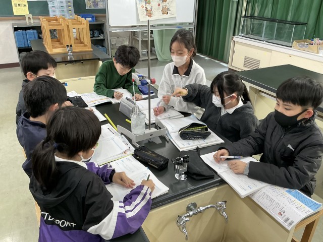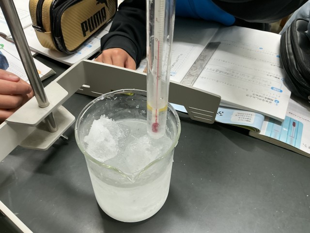 水を冷やしたときの温度の変化と様子を調べる実験をしました。0度近くになり、水が凍っていく様子をじっくりと観察できました。