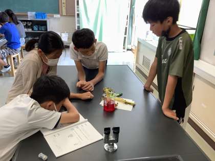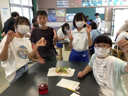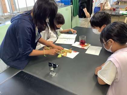 6年生がセロリを使って植物の水の通り道を調べました。赤く染まった様子から、水の通り道がよく分かり、熱心に調べたりノートに記録したりしていました。
