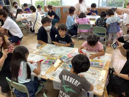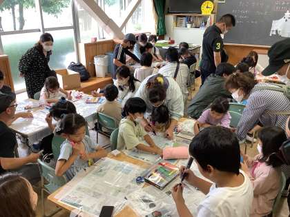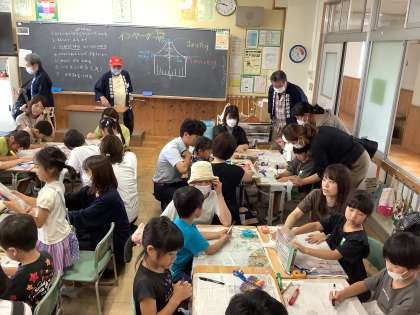 今日は親子ふれあい活動を行いました。講師の方をお招きして、学年ごとに工作や陶芸、ニュースポーツ等を親子で楽しみました。1年生は桜井凧保存会の方に教わってインベーダー凧を作りました。