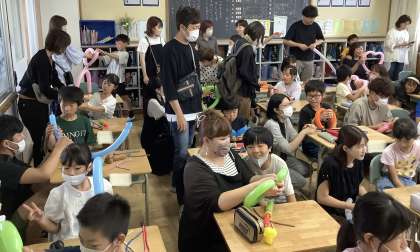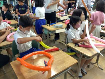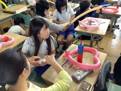 3年生はバルーンアートに挑戦しました。風船が割れてしまうのではないかと、どきどきしながらハートや犬などを作りました。